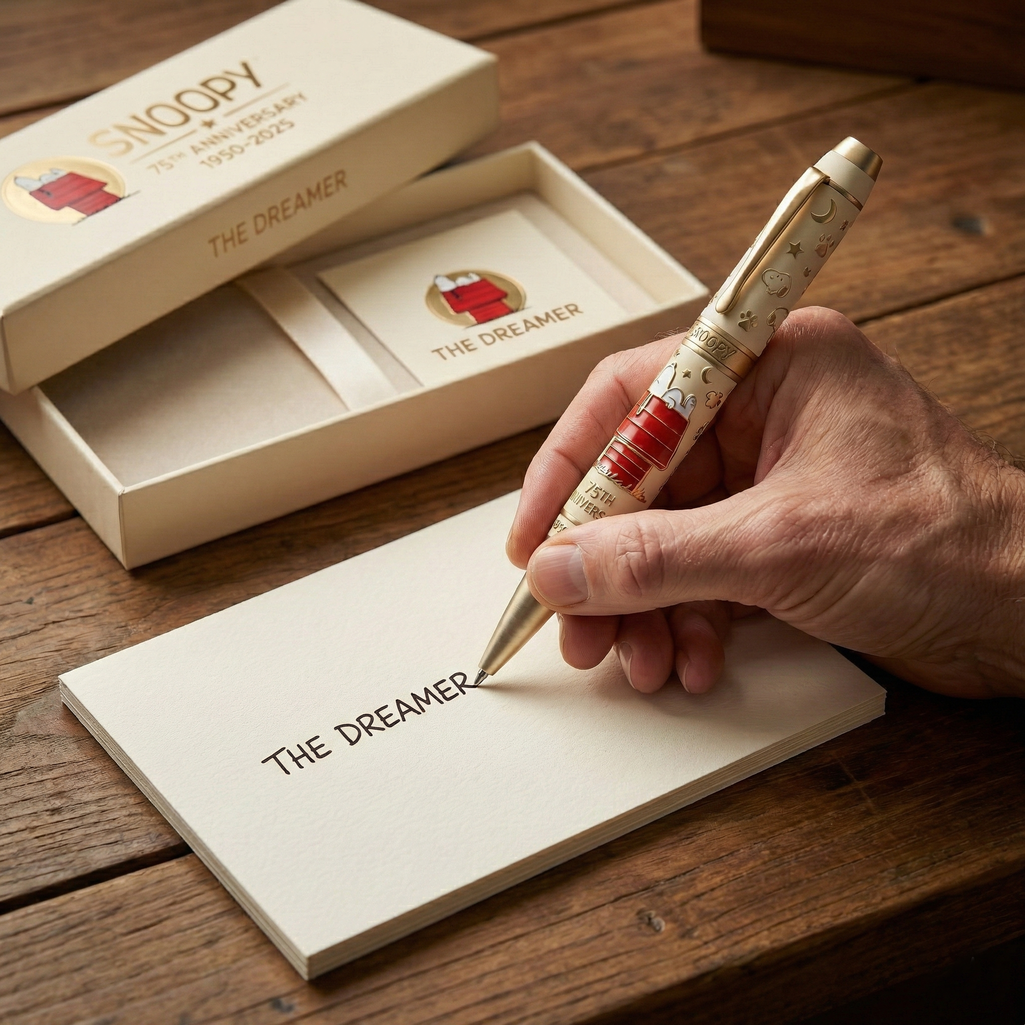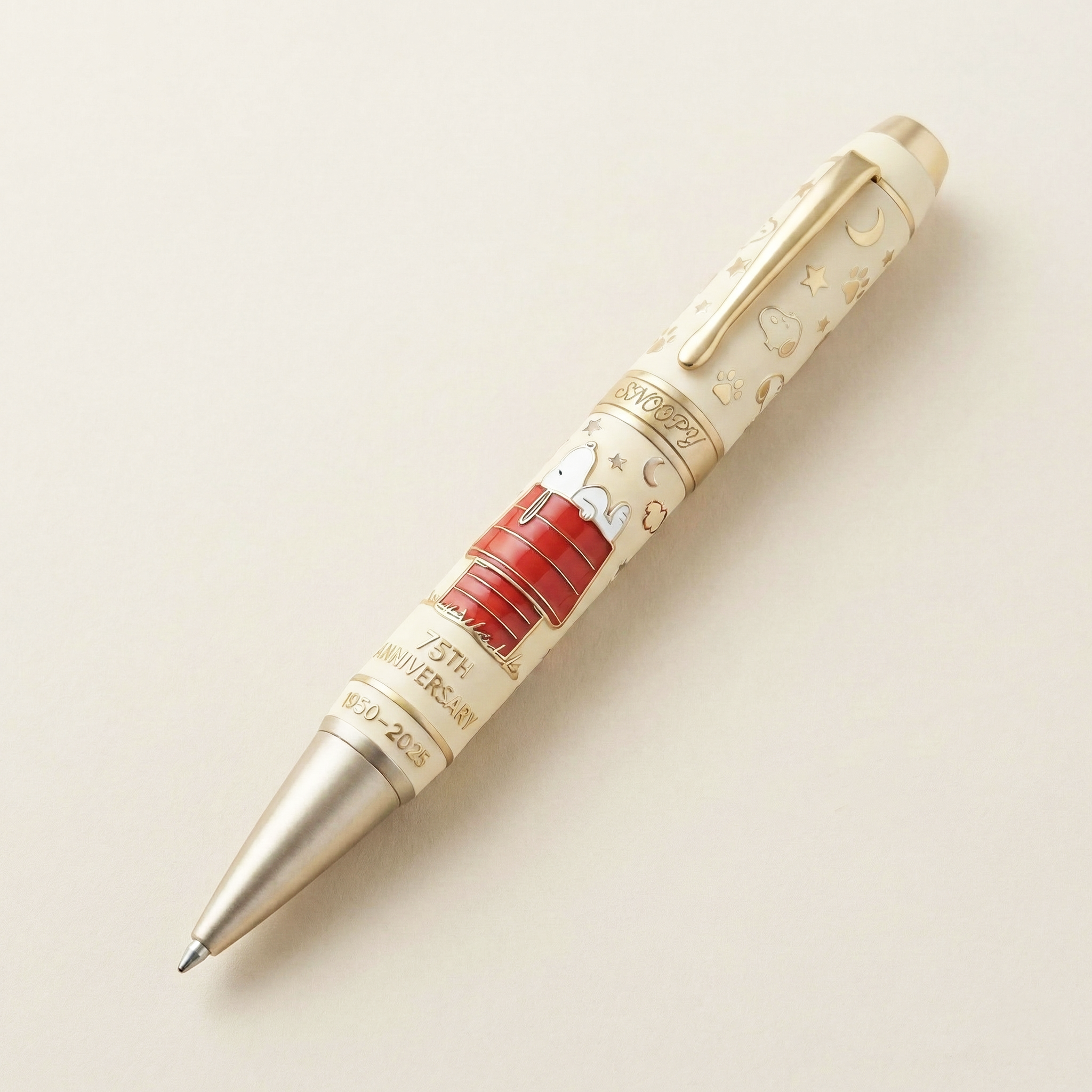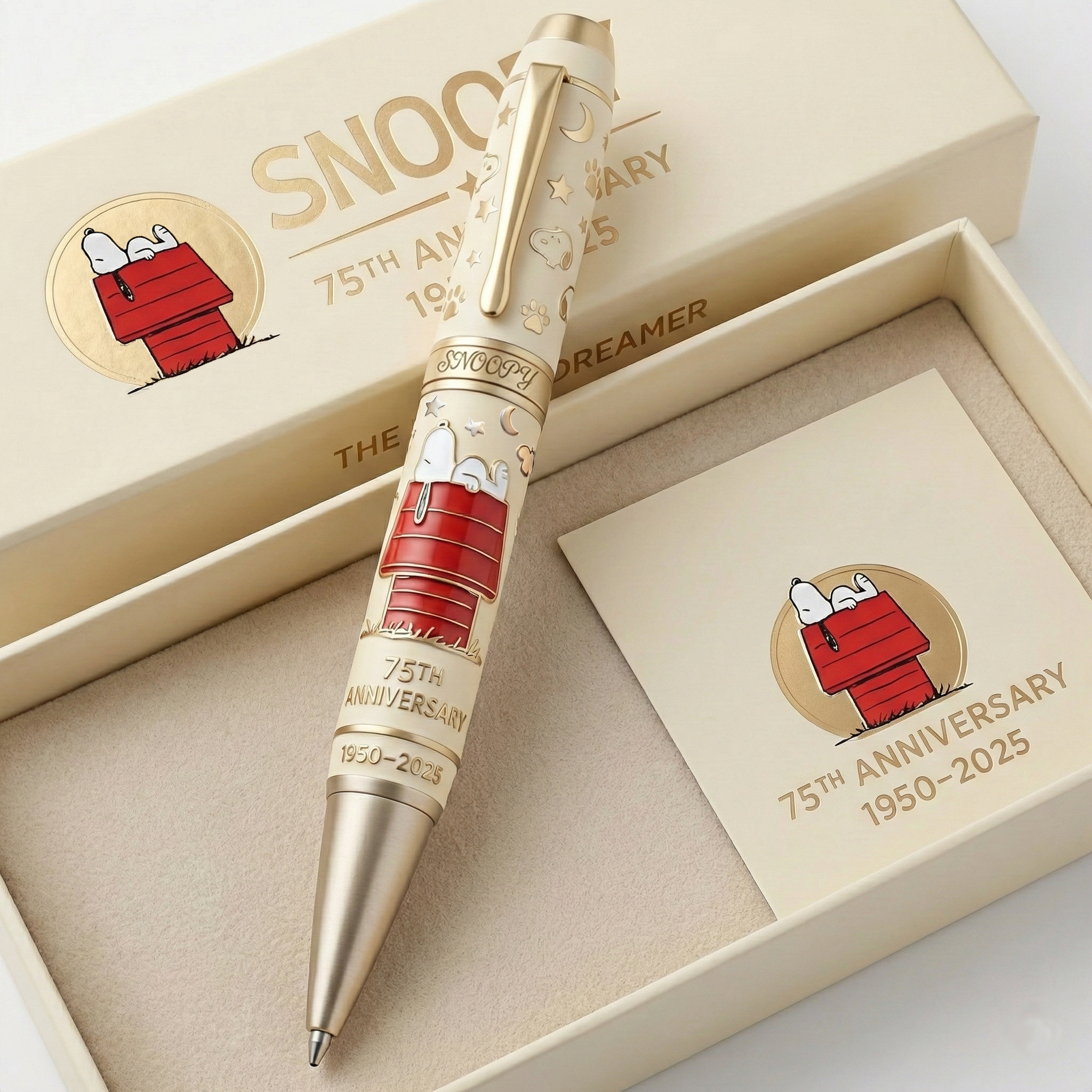 🐶🥰 Celebrate 75 years of Snoopy with a pen that turns nostalgia into something you can hold, feel, and use every day.Crafted with elegant ivory enamel, warm gold accents, and a raised Snoopy-on-the-doghouse design, this anniversary pen isn’t just a writing instrument—it’s a heartfelt tribute to childhood memories, imagination, and timeless American pop culture.
