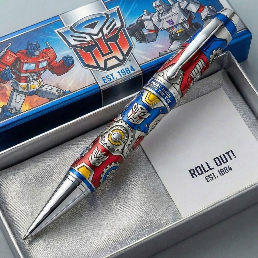 Transform your writing experience with this Transformers commemorative pen, designed to celebrate the legacy of the iconic franchise. Featuring detailed engravings of Optimus Prime, the Autobot insignia, and mechanical elements, this pen is a true tribute to the world of Transformers.